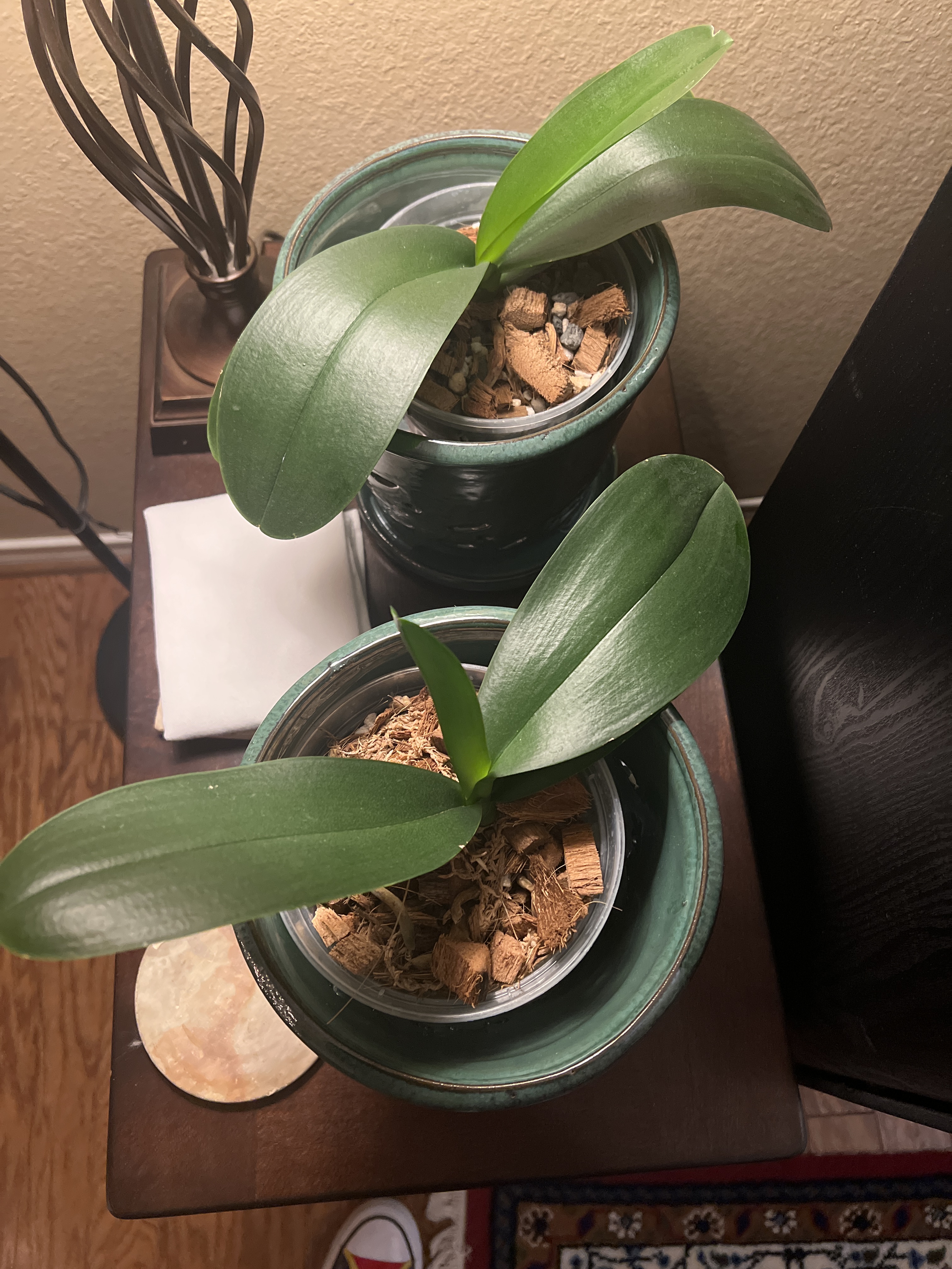 I was able to get Poche and Chandebise settled into their new pots and placed them near an eastern-facing window. By October, both orchids had new leaves beginning to grow.
