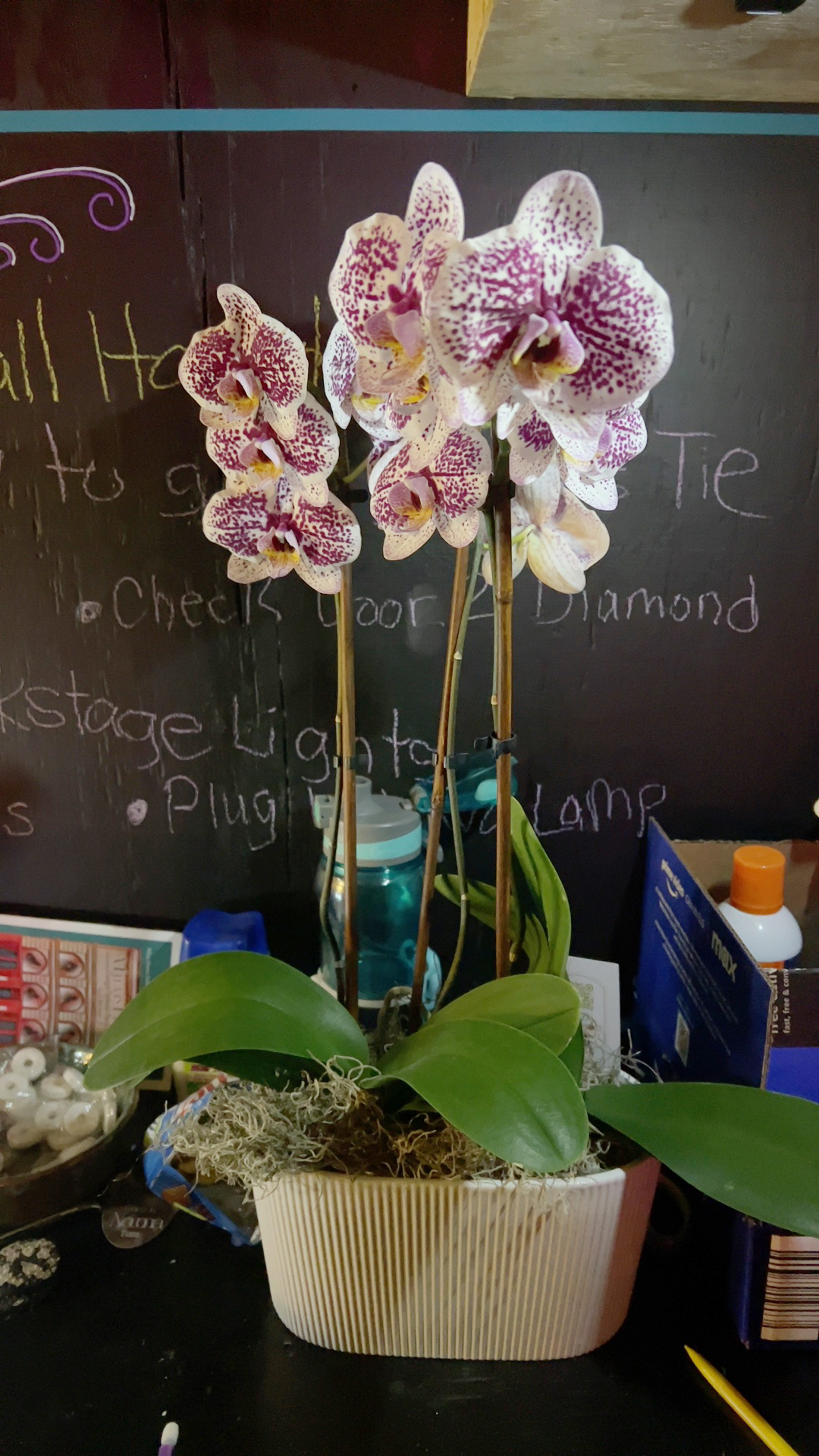 I was gifted not one, but two orchids by the director of a theatrical production that I stage managed and created the lighting design for. It was called A Flea In Her Ear and was the story of two doppelgangers: Poche and Chandebise. As names evolved for my orchids, I decided they would all be named after characters from the plays that I worked on. Since these were “twins” of a sort, I knew they needed to be Poche and Chandebise.