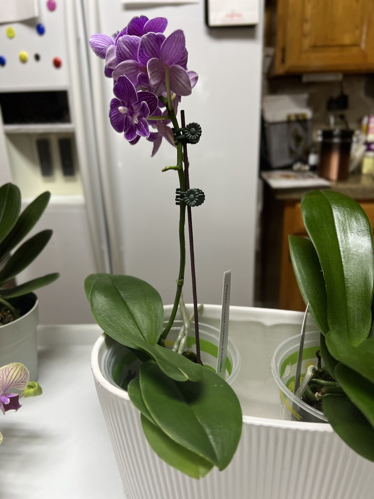 Not long after the royal arrival I purchased another phal. from HEB, a Phalaenopsis No ID (Fuller’s Gold Stripe) that I named Alais.