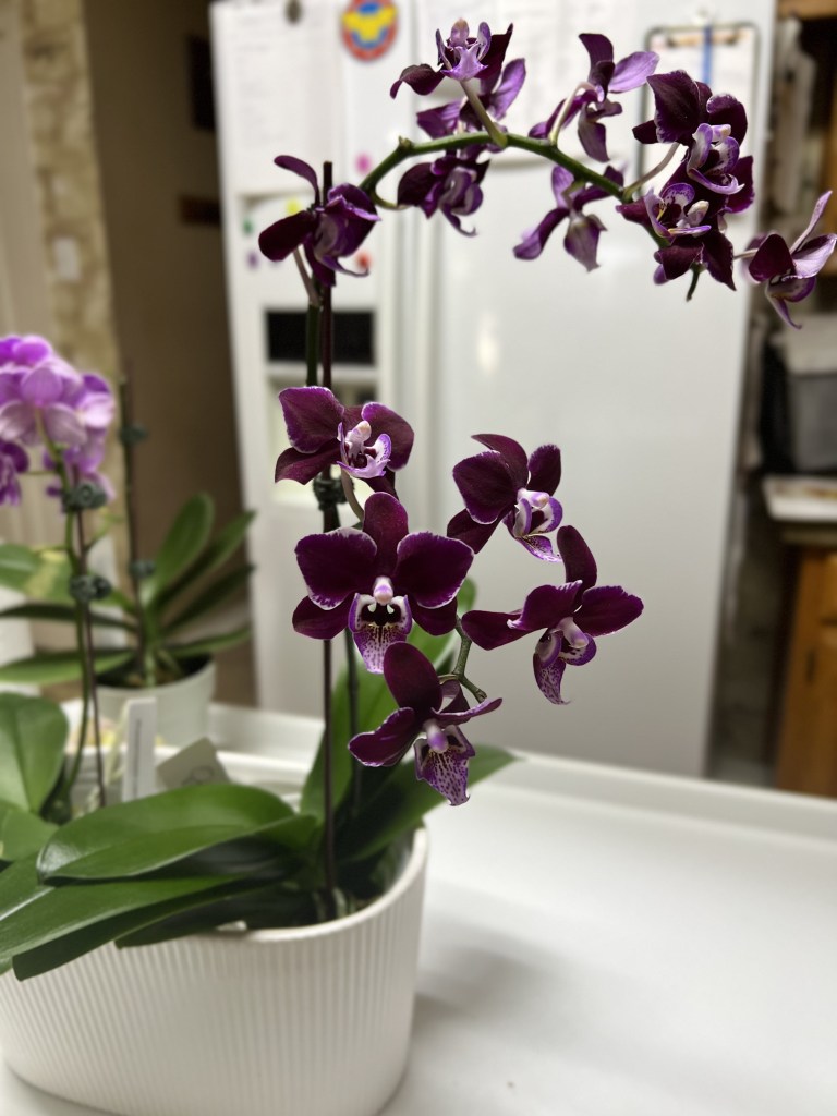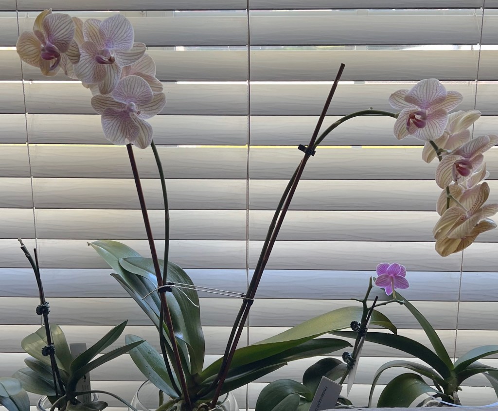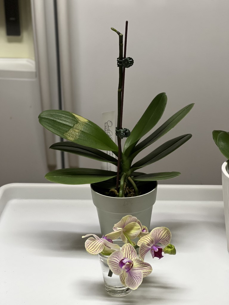 While I was struggling with Hootie Pie, my phalaenopsis orchids were doing well, so I thought I’d try purchasing orchids on line. This led me to OrchidClassics.com where I purchased 2 new phalaenopsis orchids. A Phalaenopsis Lianher Seallops and a Phalaenopsis Lianher Cranberry Cha-Cha. I was so excited when they arrived, and even more so when I found a third orchid in the package, a Phalaenopsis Fuller’s Gold Strip. Unfortunately, her spike was broken and her four blossoms were loose in the box. The good news was that there was enough of the spike left on the blossoms to put them in water in a shot glass, and the break was just above a secondary spike that had a bud on it. There would be more flowers!