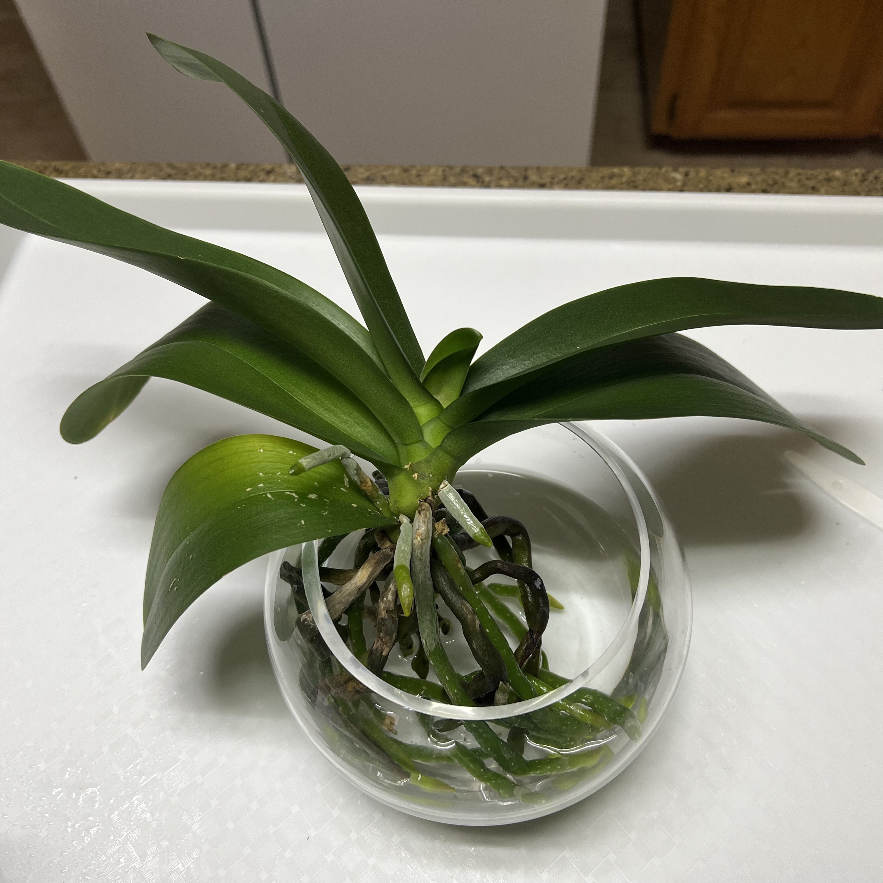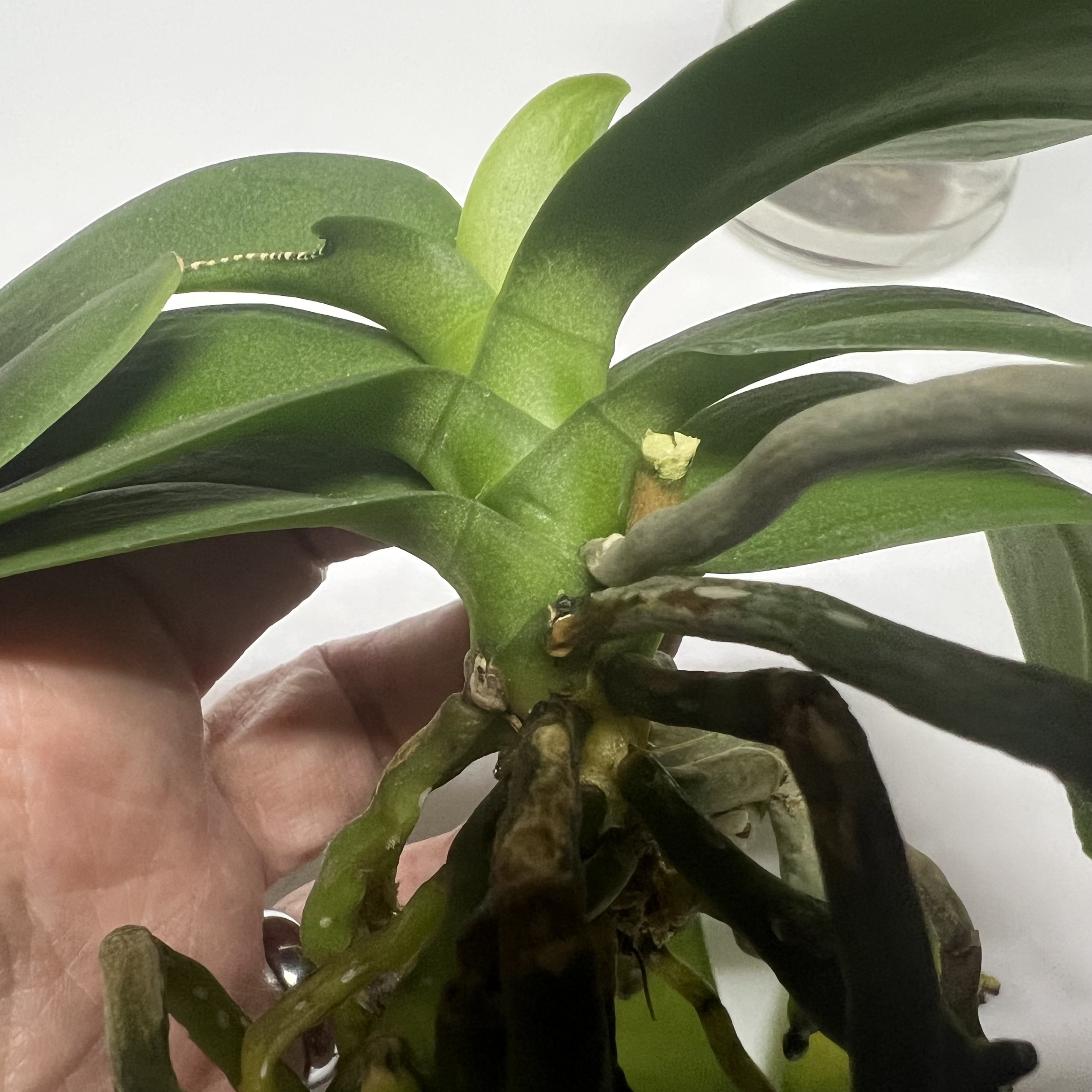 Two lower leaves were yellowing and becoming weak so I removed them along with the leaf matter attached to the base. Her root system is stable with no signs of root rot. All roots are looking green and well hydrated despite only two or three roots in the water. She has a new leaf growing. Moving to winter plan of 2-day soak/5-day dry cycle until March or April. Note: I learned today to leave leaves until they fall off on their own.