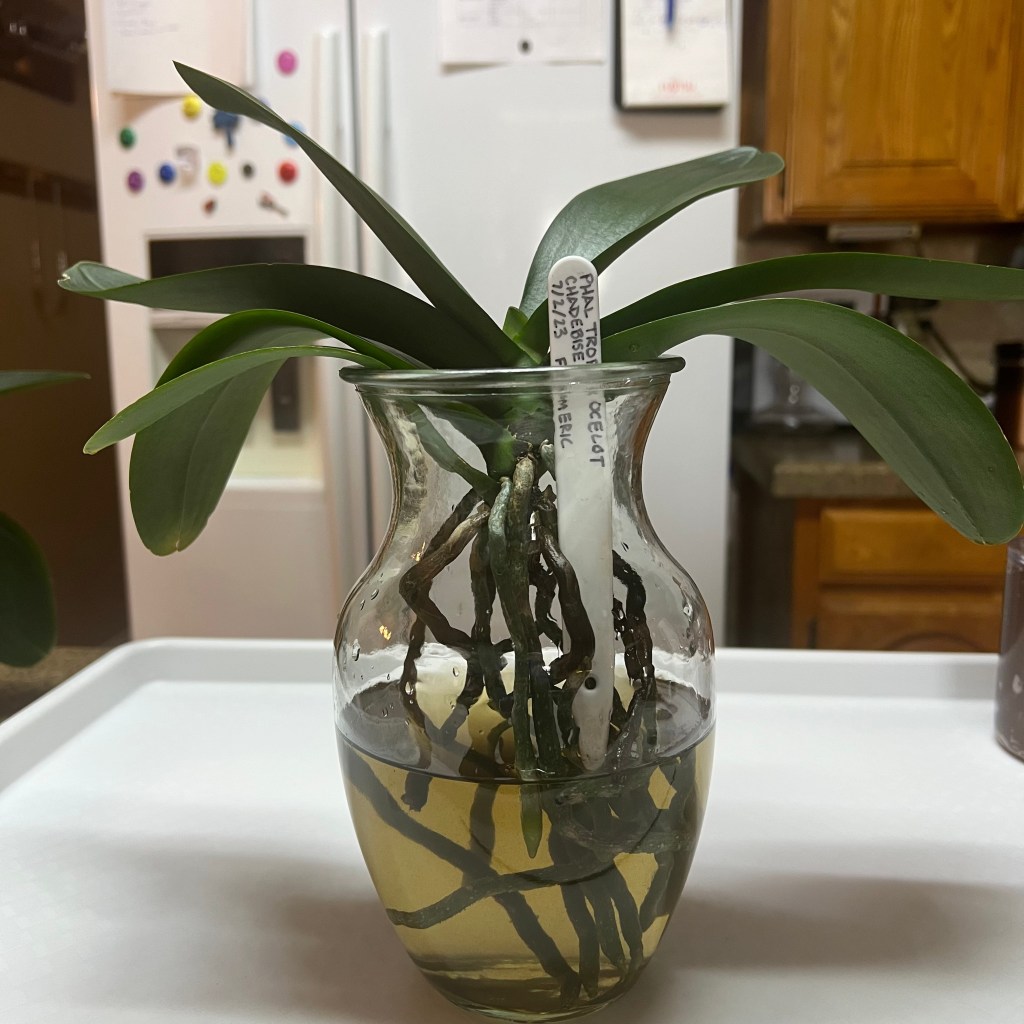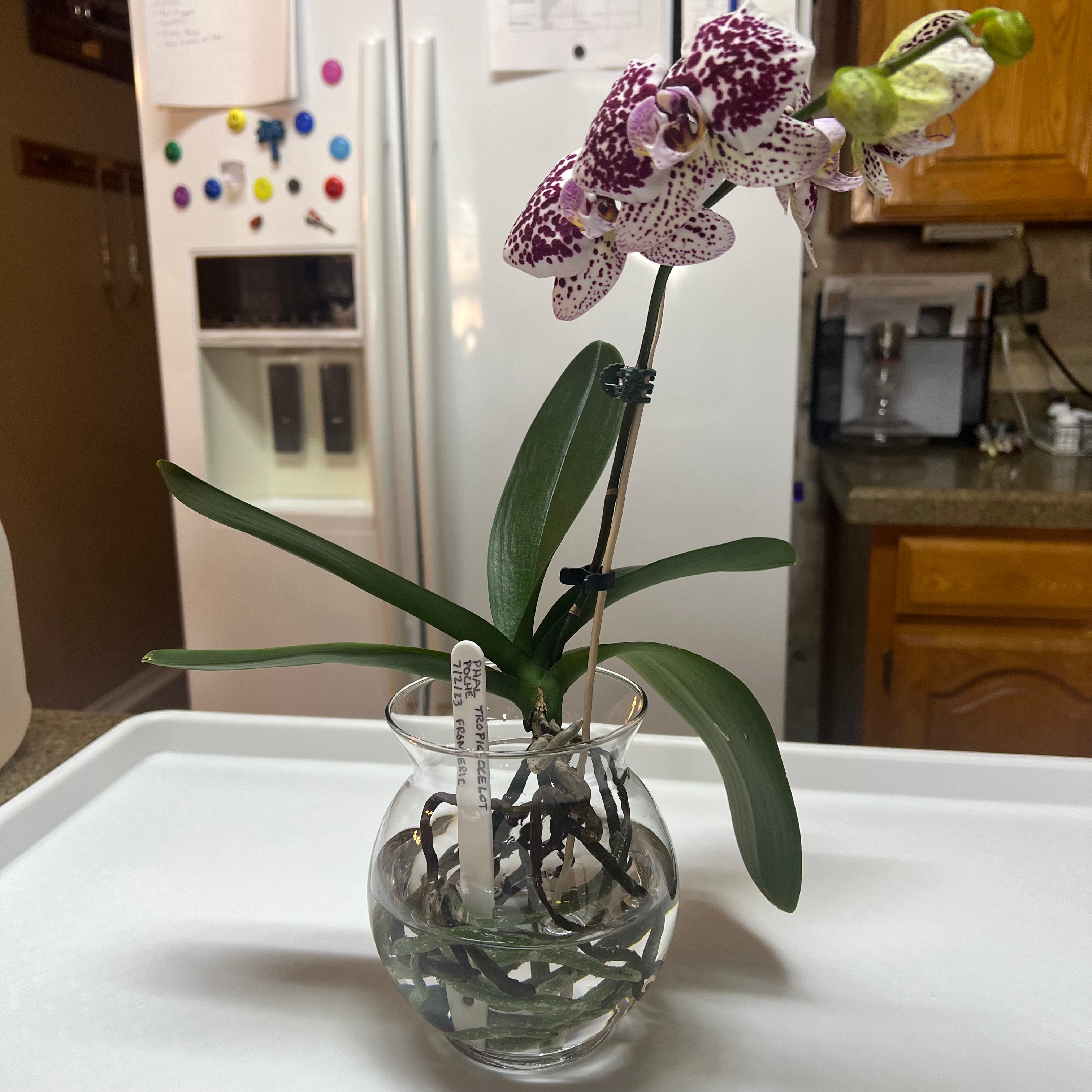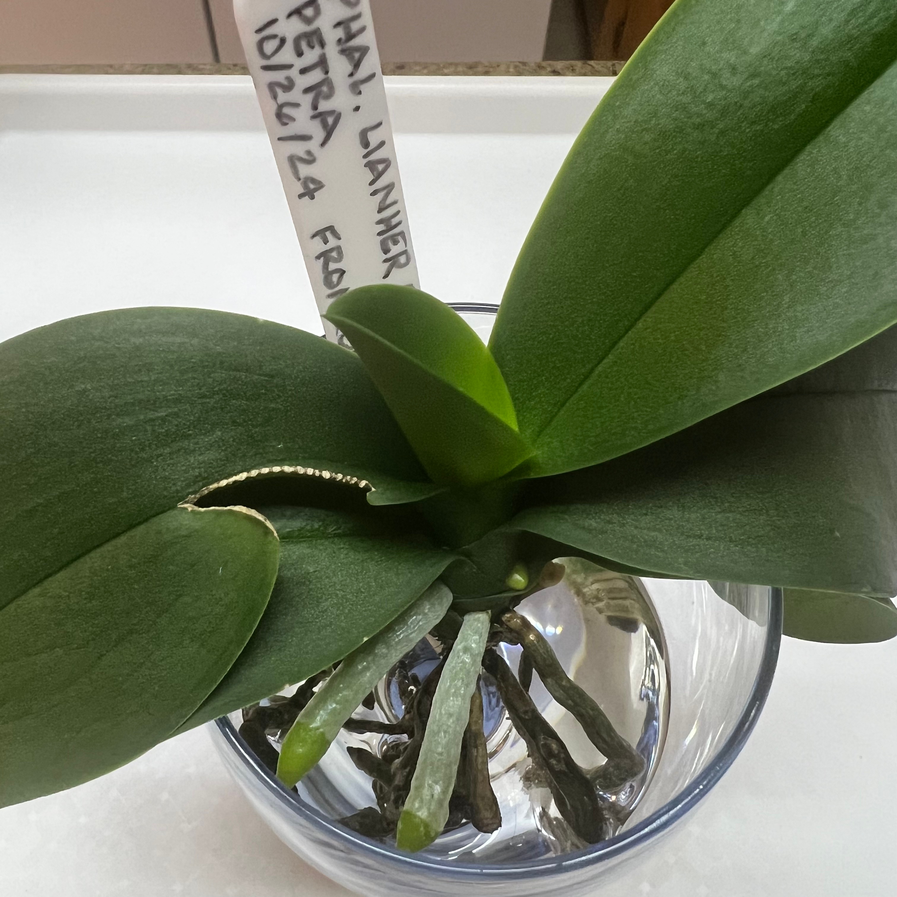 One of Petra’s leaves was damaged when she arrived from Orchid Classics, but despite that, she has adapted well to Water Culture. She has both original and new roots
