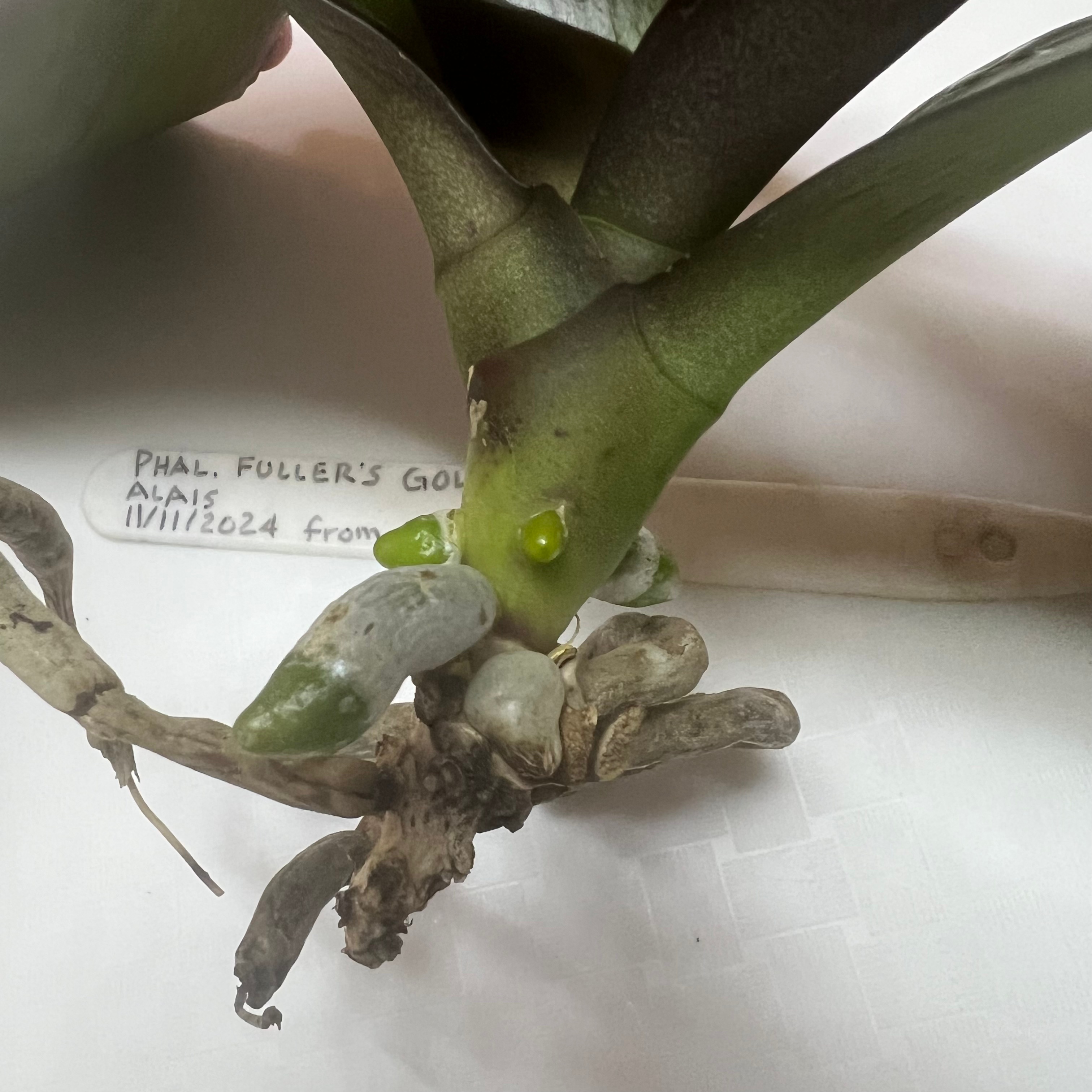 Alais has lost almost all of her original roots before new roots could grow to replace them. The bad news is that I removed the dying roots instead of just removing the velamen and leaving the string roots. The good news is that there are new roots coming on that will eventually nourish Alais.