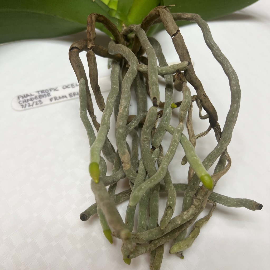 Care Note: When the velamen on an orchid’s roots becomes soft and mushy, it’s not working properly. Deteriorating velamen in the water encourages harmful bacteria that can further harm the plant. Therefore, the velamen should be removed, leaving just the inner string root. These “strings” can still provide some water to the orchid, but only about 10% of what a healthy root can deliver. When an orchid is dehydrated, even this small amount from the string roots is better than nothing.