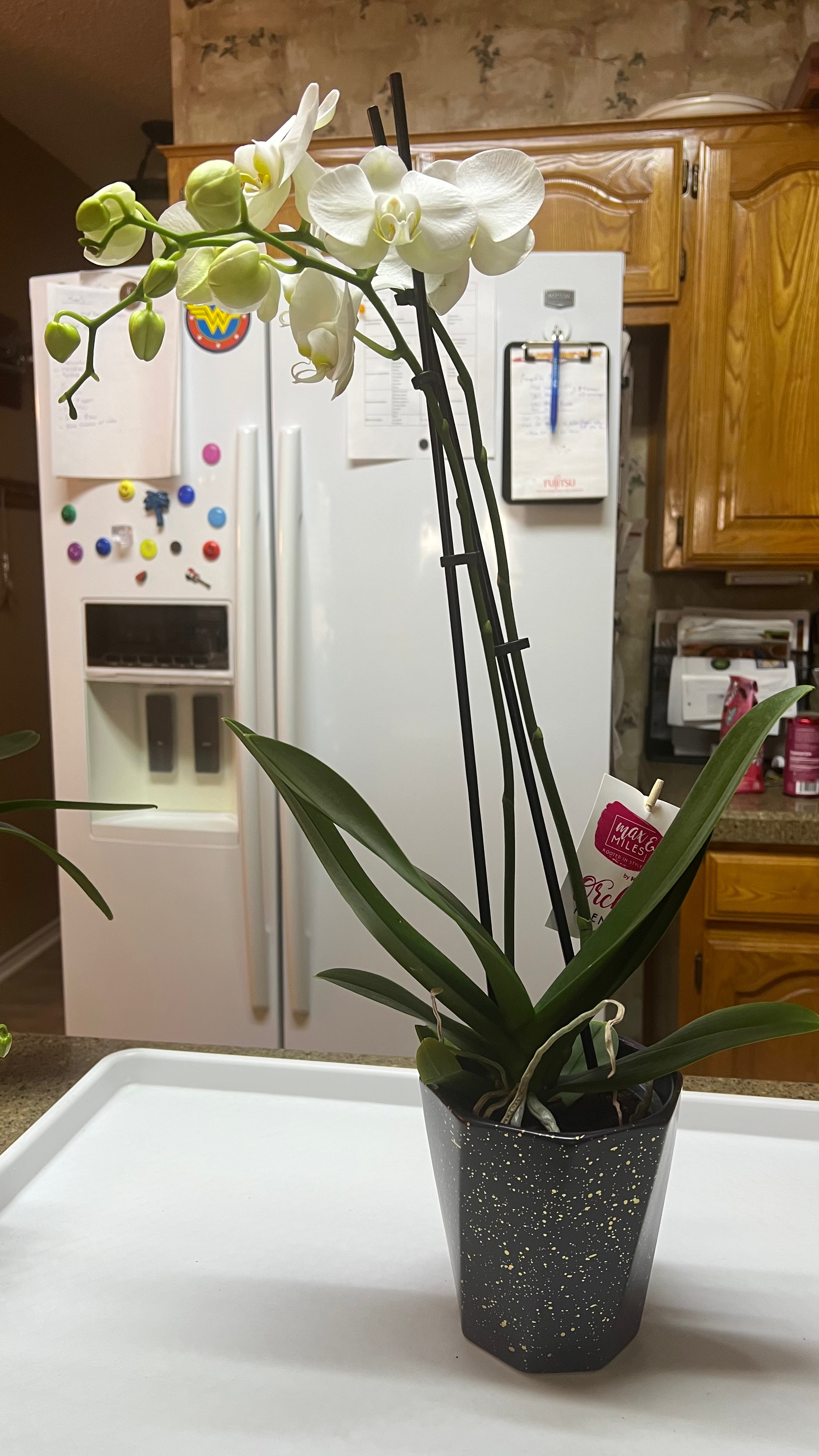I had wanted an all white orchid for a while, and on March 5, my local HEB had some on sale! So I selected one, brought her home and named her Irene Adler. The goal for Irene was to let her stay in the orchid media in which I purchased her for as long as possible to reduce stress on her. Six days later, her leaves were softening and I was beginning to see the tell-tale wrinkles caused by dehydration. Experience is teaching me that orchids from the grocery store are not bred to live for years. Instead, they are bred to create more flowers, despite the limitations of the plant. It’s kind of like a puppy mill but with flowers