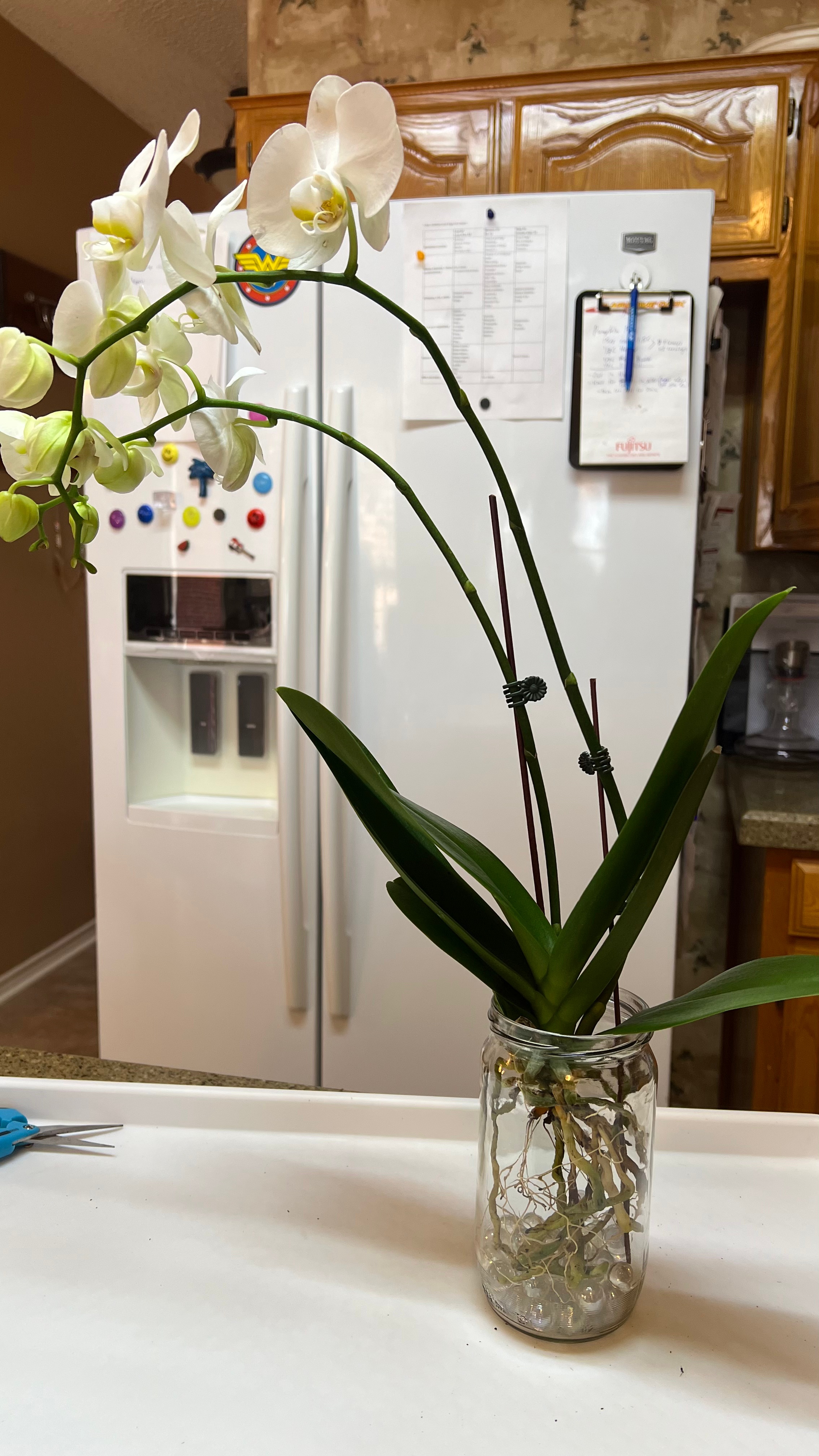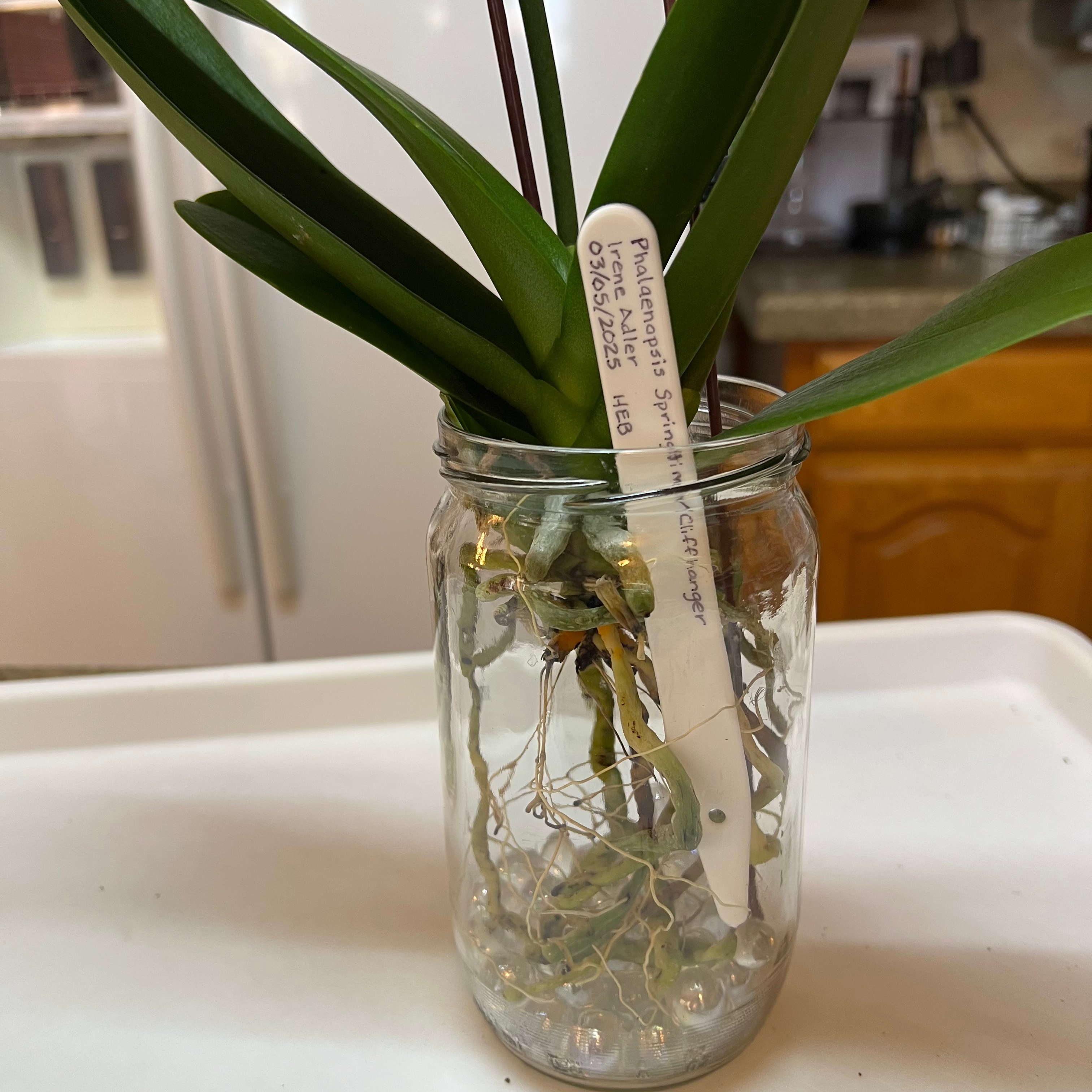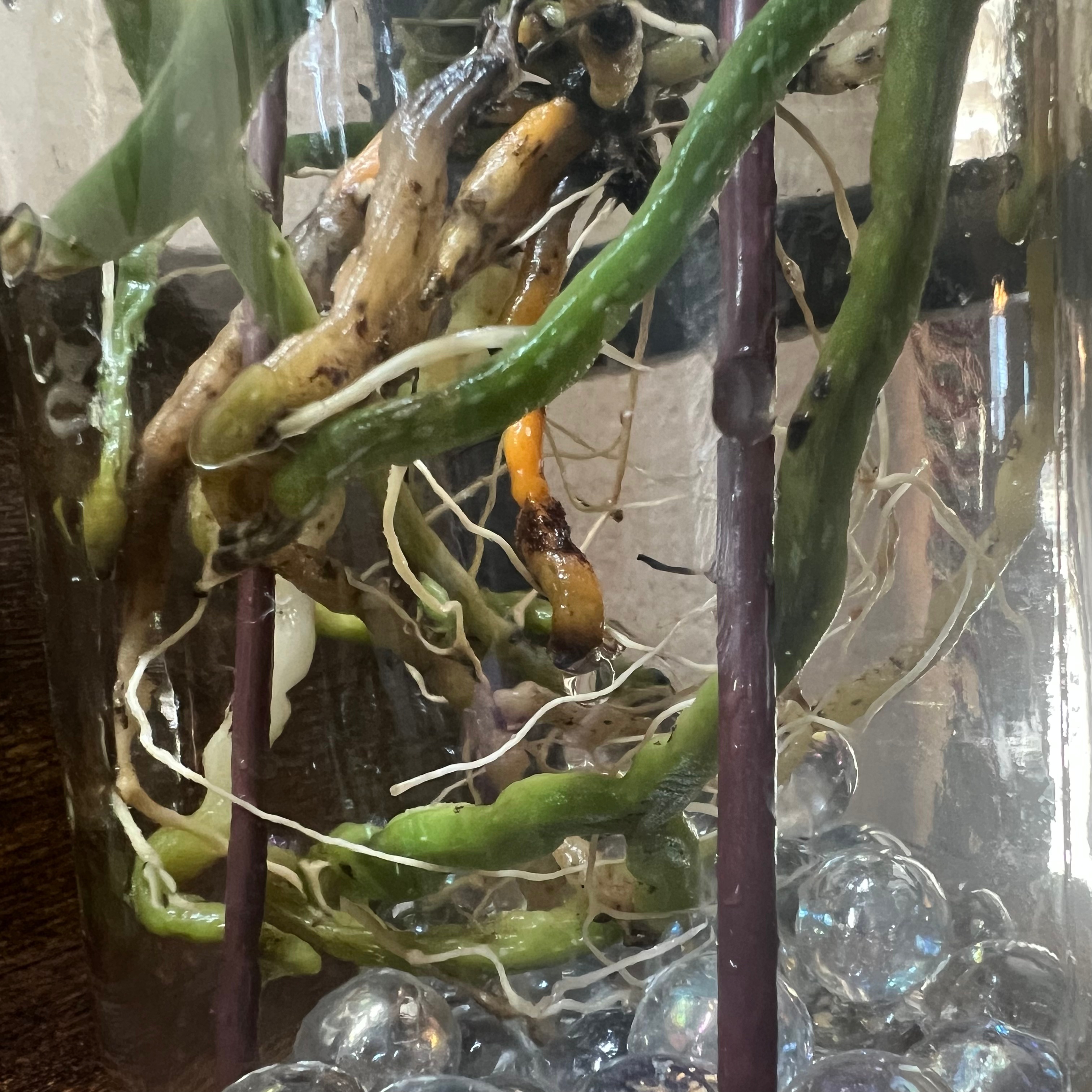 I cleaned the bits of moss and bark from the roots and slid the velamen off of the mushy roots. I then put her in a jar with some glass beads in the bottom to keep her thick roots out of water and left her for 24 hours to dry. I then added water with Super Thrive for 24 hours. After that, I lowered the water level to the top of the glass beads which provided the longest roots and string roots with water. I would continue this process with once per week soakings followed by low water/dry days.