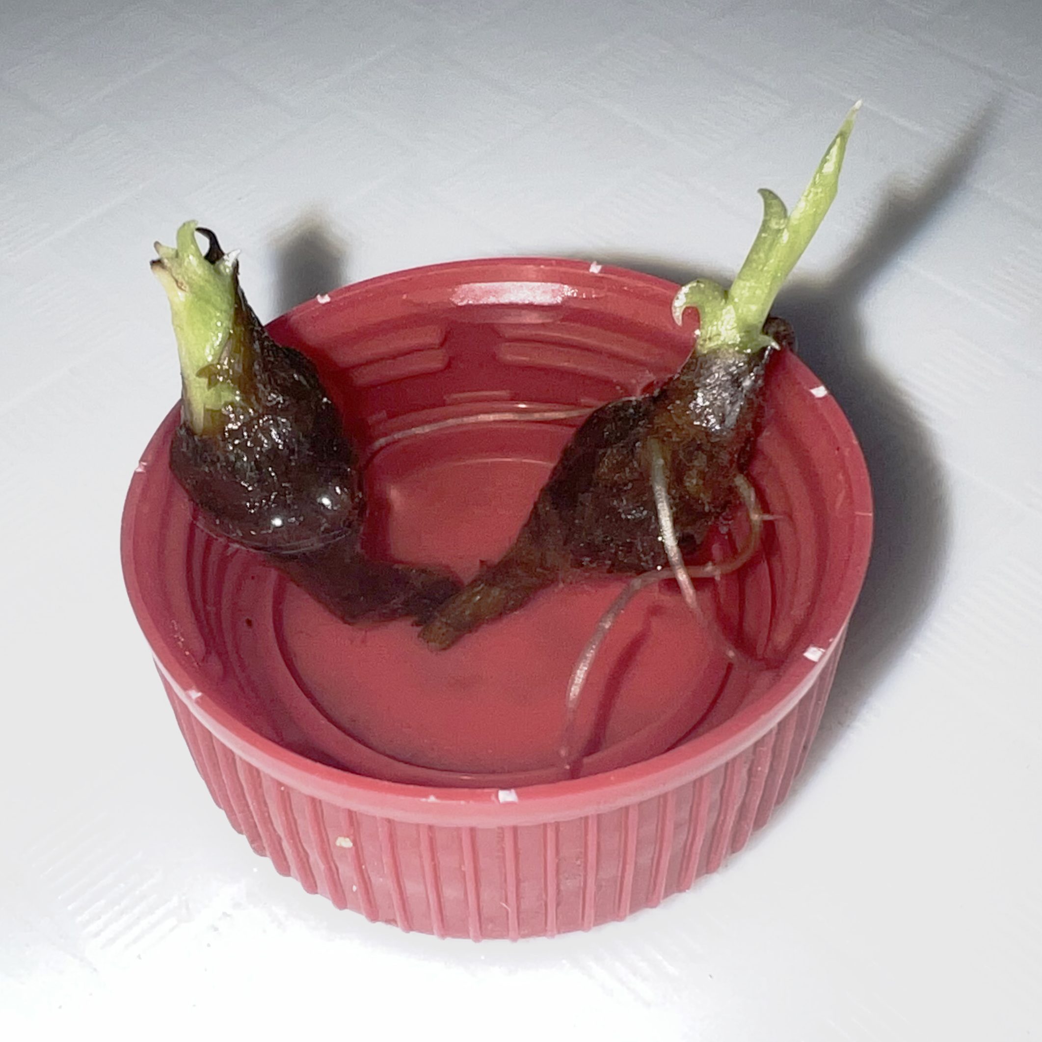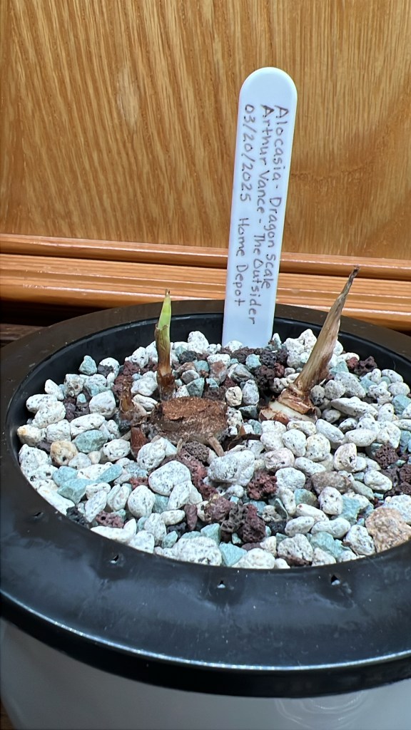 Meanwhile, a couple of months ago, I think it was when I added the wick to his pot, I found two corms and they are both sprouting! I should have two new Alocasia Dragon Scale plants early next year.