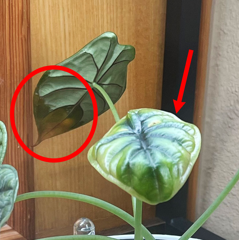 Drogon’s problems began well before our trip. He had always dripped water from his leaves, but that can be normal for some Alocasia. What I failed to pay attention to was his newest leaf yellowing (see arrow), and other leaves with damage on their underside (see circle). Both of these symptoms pointed directly at too much water. But wait, he was in PON, I wasn’t supposed to be able to over-water him.