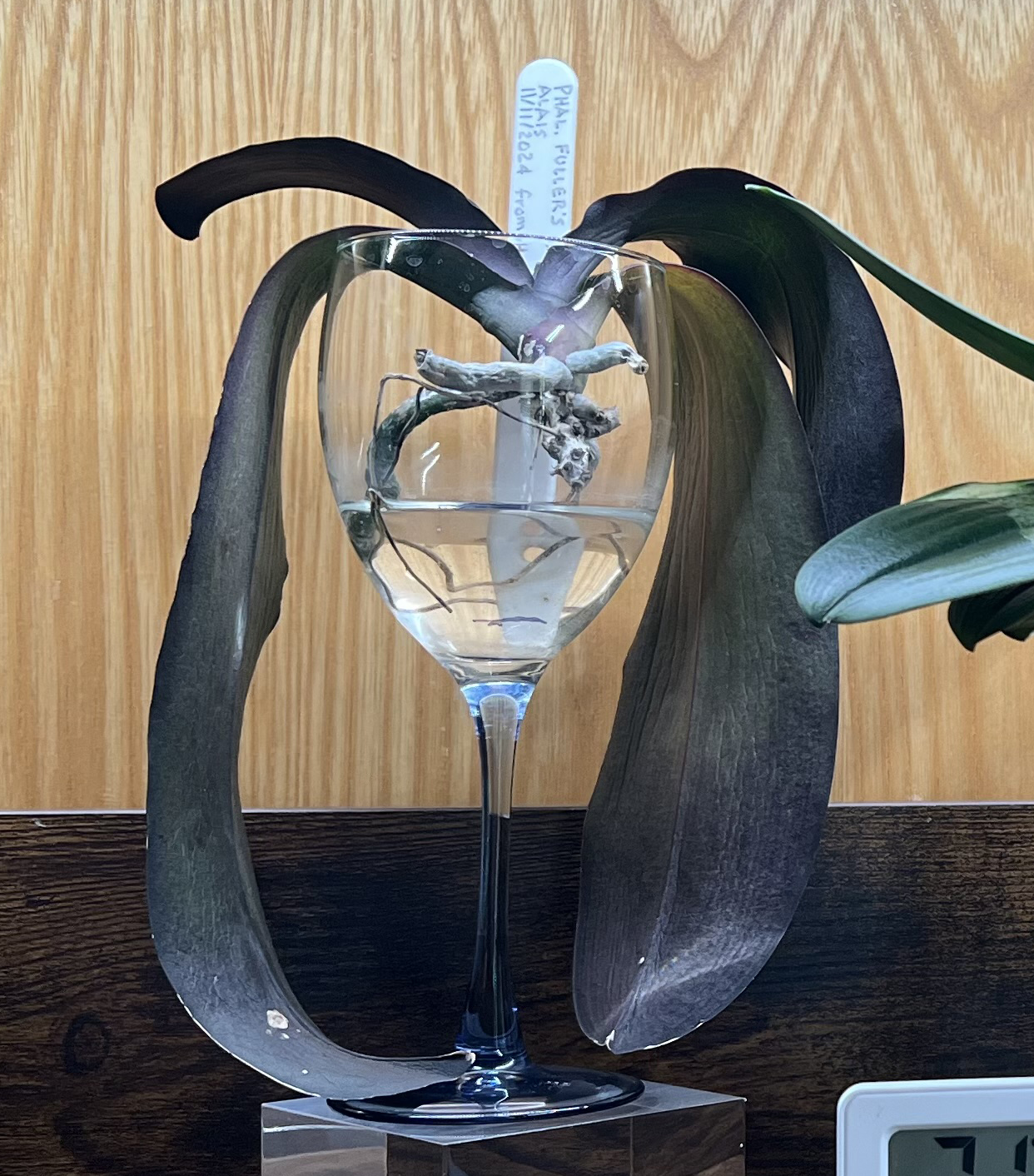Alais had been struggling for quite some time due to root loss. When we left, she only had one new root that reached the water. While it’s normal for an orchid to lose roots while new water roots are growing in, Alais never really adjusted to water culture. My best guess is that I moved her too quickly into water. I have now refined my method to something that works better: Start with short lengths of wet and dry days and slowly increase the wet days working toward 6 wet/1 dry.