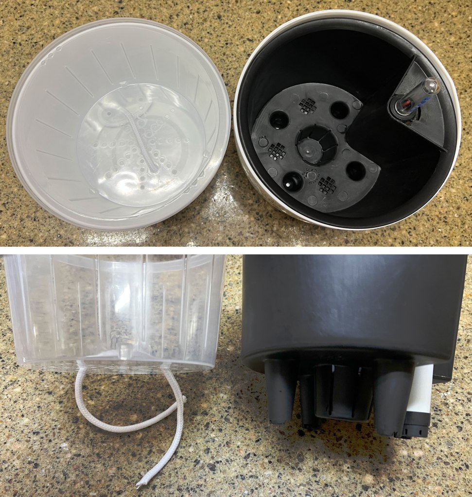 The self-watering pot on the right is the pot Drogon was in. My theory is that I over-thought the process. I had seen a video where the wick had been drawn up into the substrate to ensure the roots had plenty of water. I knew that Drogon’s pot didn’t have any wicking, so I added wicks, starting them down inside the legs and working them up through the substrate. I didn’t let the pot do its work. I believe that the wicking was keeping the PON too moist.