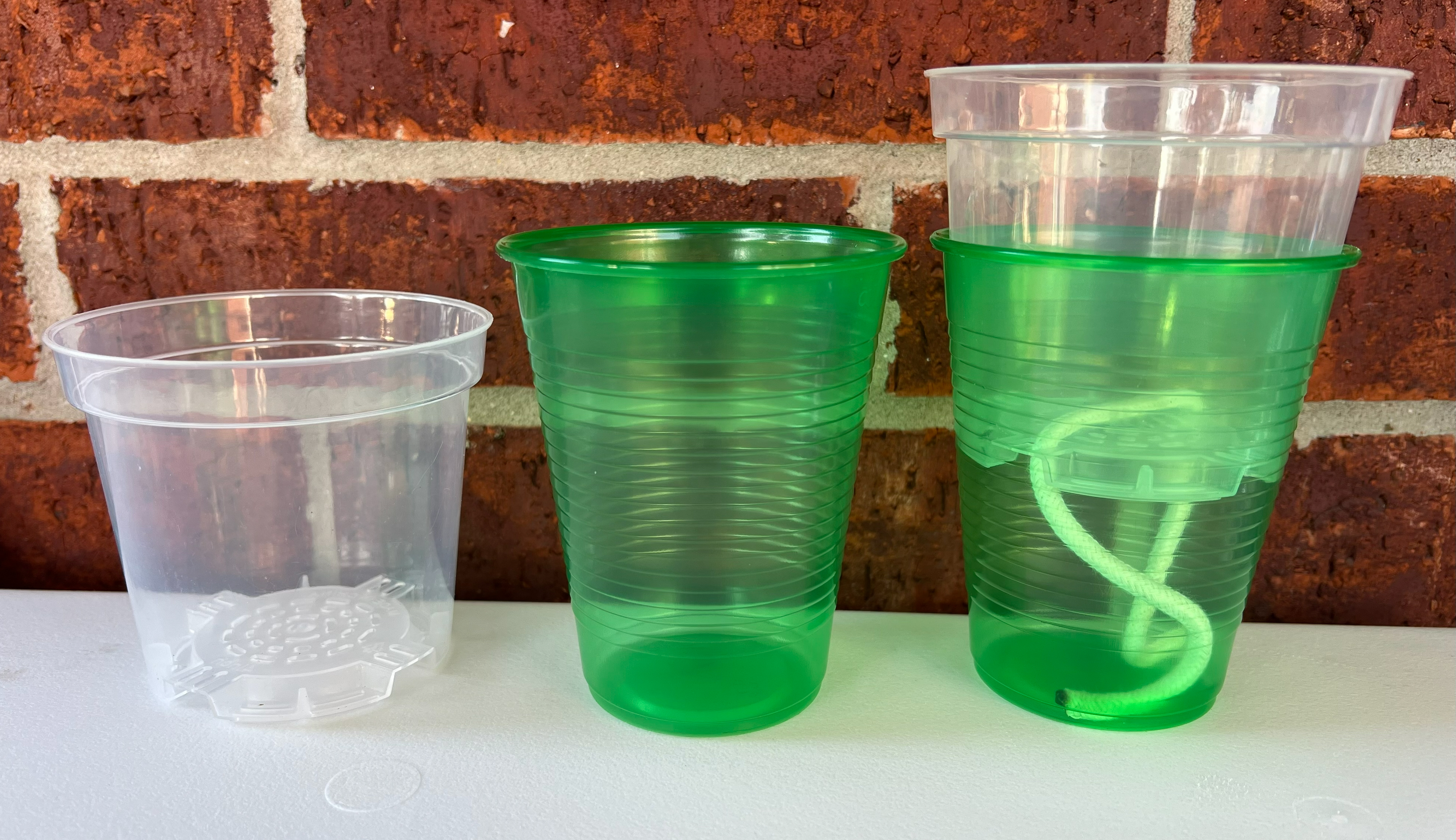 Everyone at my house knows to check with me before throwing out any clear plastic containers. If you can find two that fit together properly, you can make your own self-watering pot. The “inner pot” must sit firmly inside an outer “cache pot” with enough space at the bottom for a reservoir. I like a reservoir of 2″-4″ deep. If the inner pot doesn’t allow for drainage, holes can be added with an awl, drill, or soldering iron. You will also need wicking to draw the water up to the substrate. Nylon or polyester will work better/last longer than cotton. Cotton is organic and will eventually be prone to rotting and holding bacteria.