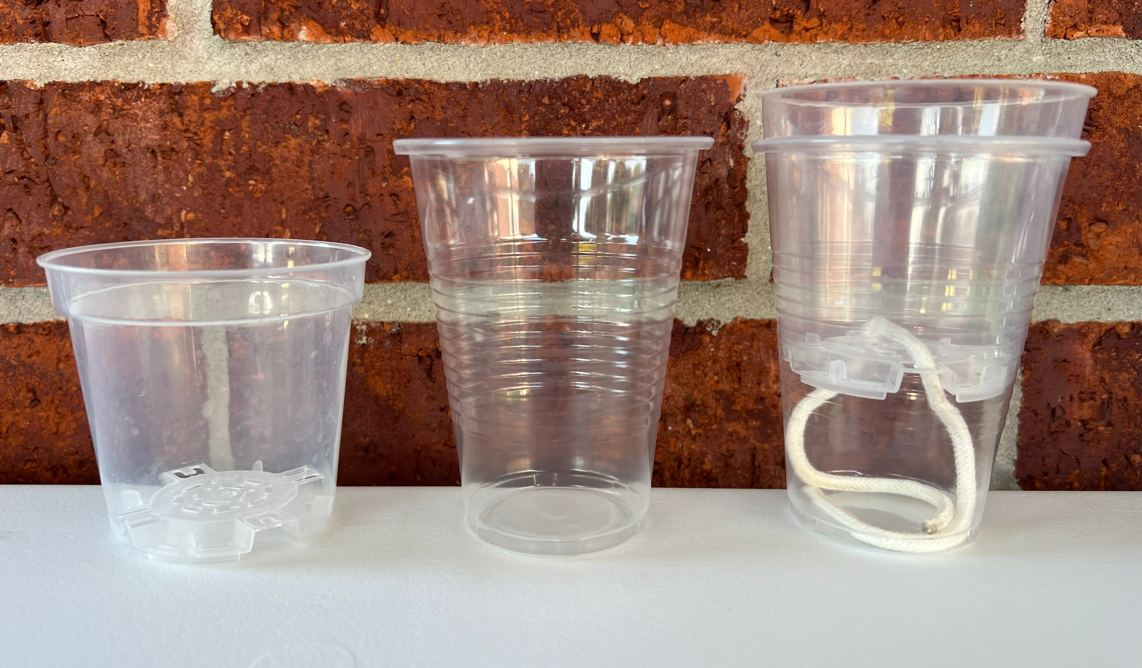 As someone who enjoys propagating plants, I frequently find myself in need of a small self-watering pot. The smallest self-watering pots I have found on Amazon are 12 – 2.5″ for $28.99 ($2.42 each) and 20 – 3″ for $21.99 ($1.10 each). The prices aren’t bad, but the inner pots are opaque and I can’t see the roots of the plant. Also, there are times I need larger or even smaller pot; so I make my own.