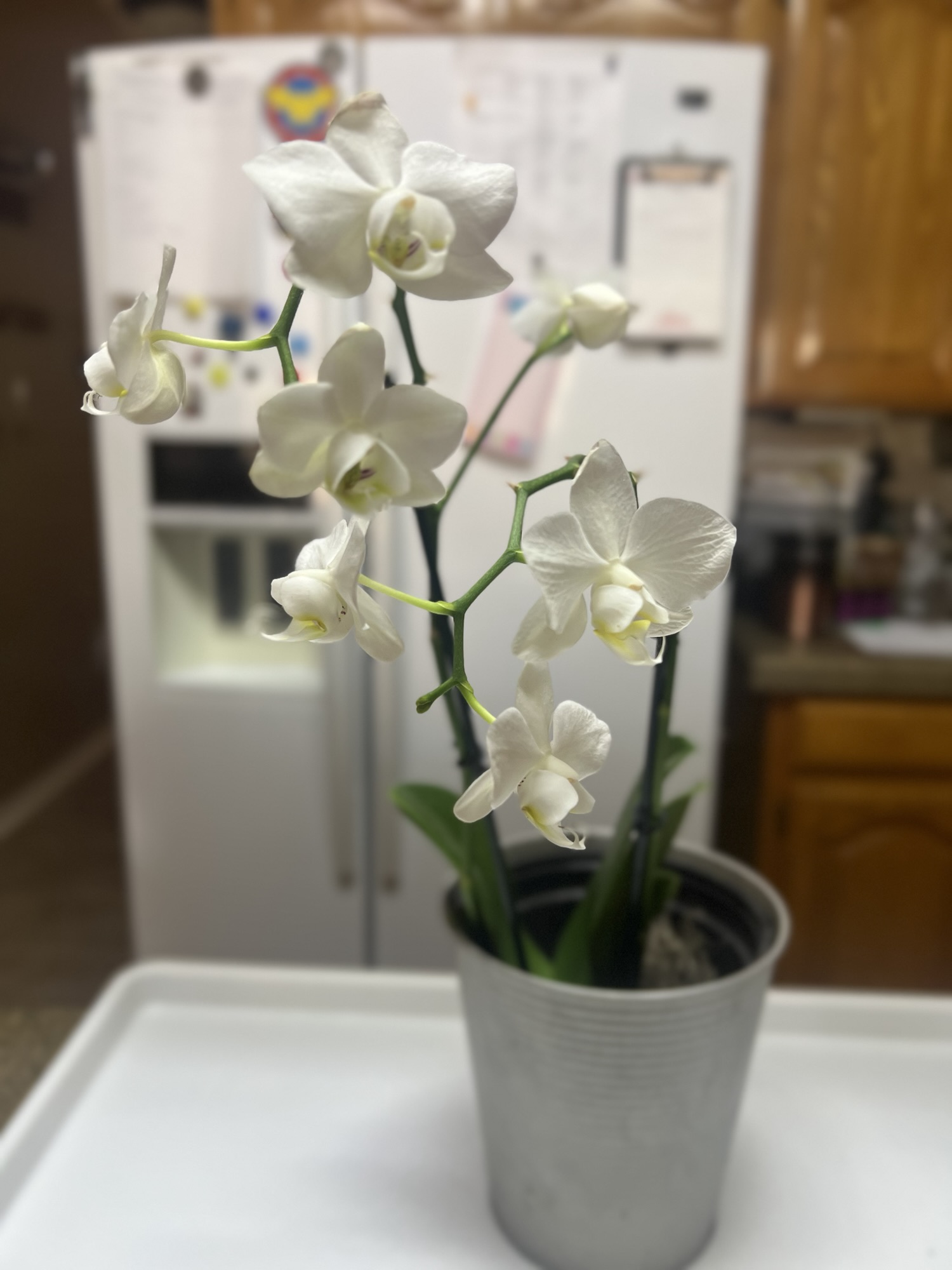 When a friend offered me an orchid (1) that she didn’t have room for, I gratefully accepted. Since this orchid came from a friend, I knew it was pest-free, so she only spent one day in quarantine. I then moved her to my orchid shelf where she stayed for a couple of days.