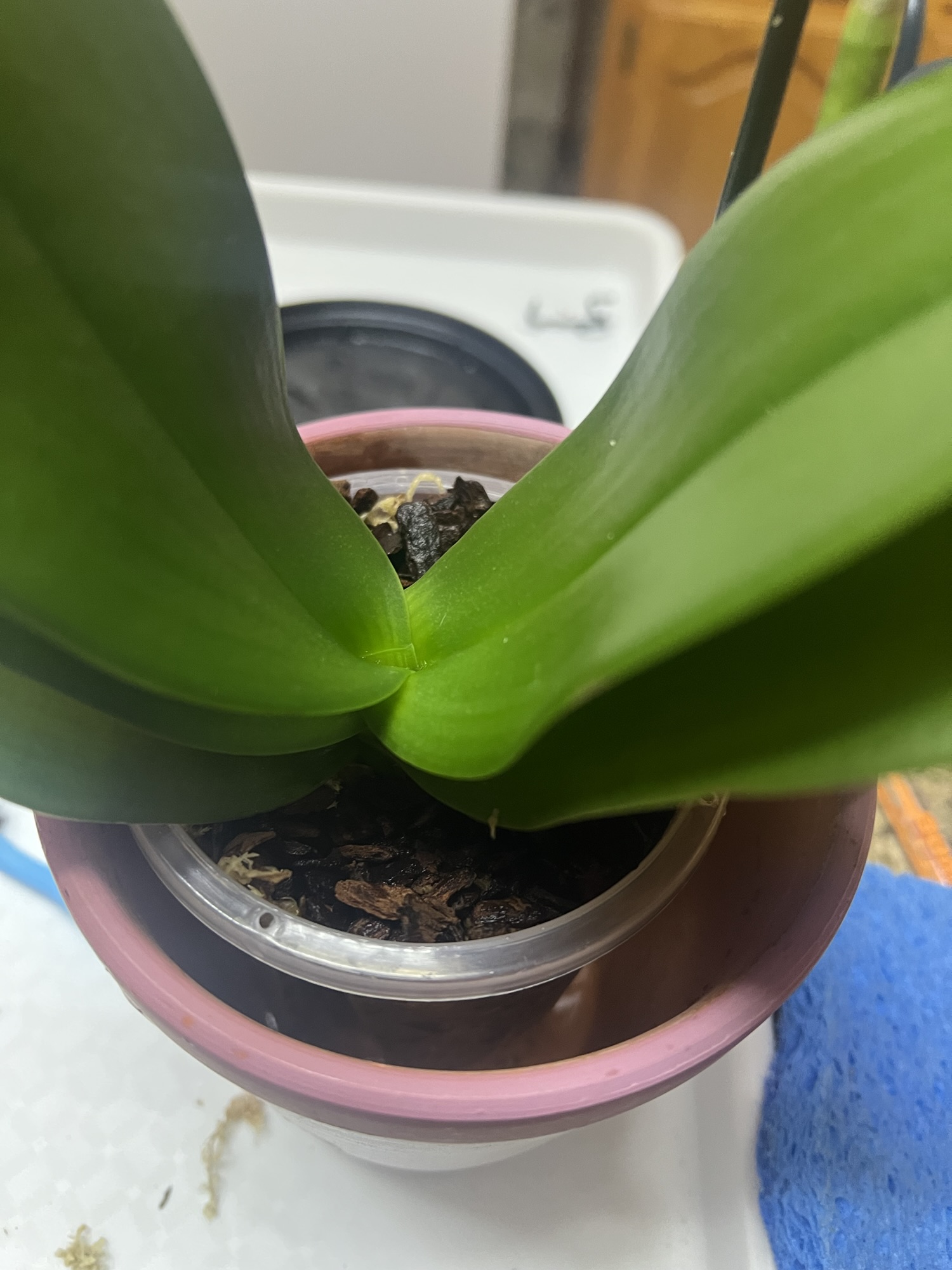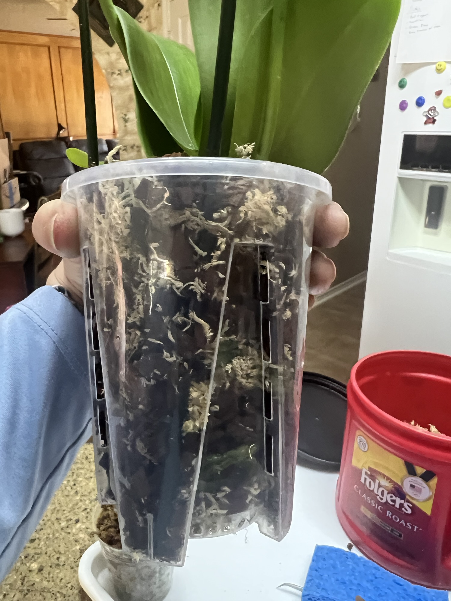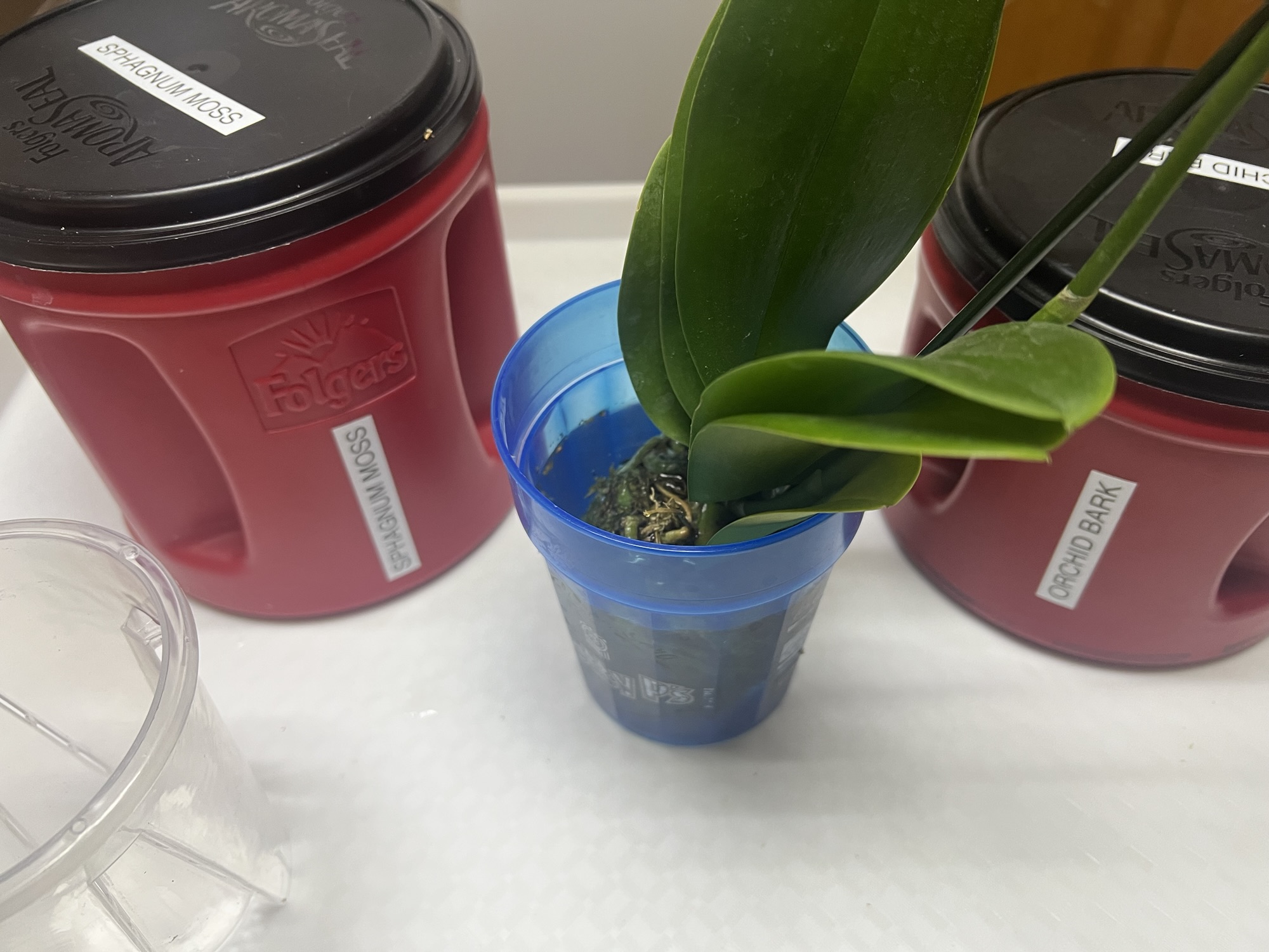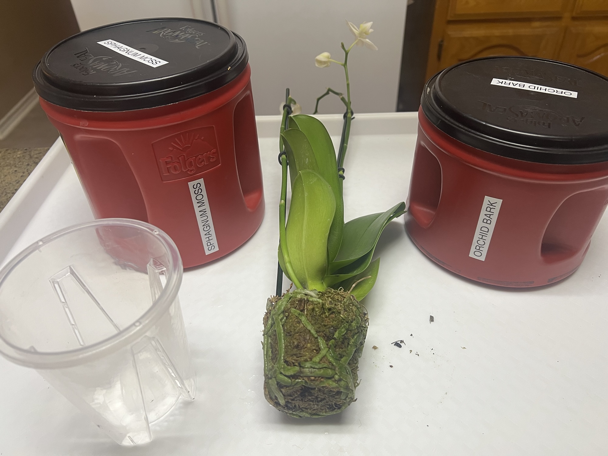 On day four, I decided to do a temporary re-pot. She will stay in this pot for about a month to acclimate to life in my house. To re-pot an orchid, you’ll need an orchid nursery pot and a larger pot with no drainage. Orchid pots have a lot of holes to allow lots of oxygen to reach the roots. You’ll also need orchid bark and sphagnum moss (2).