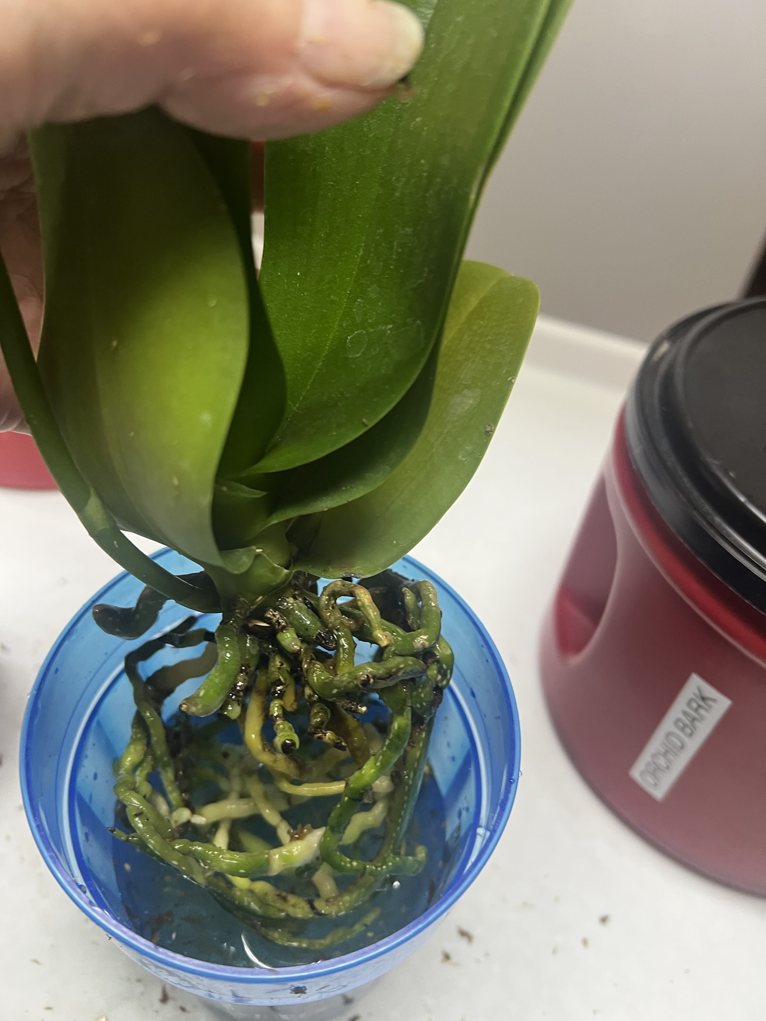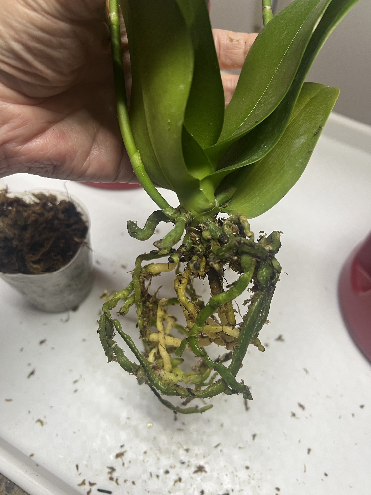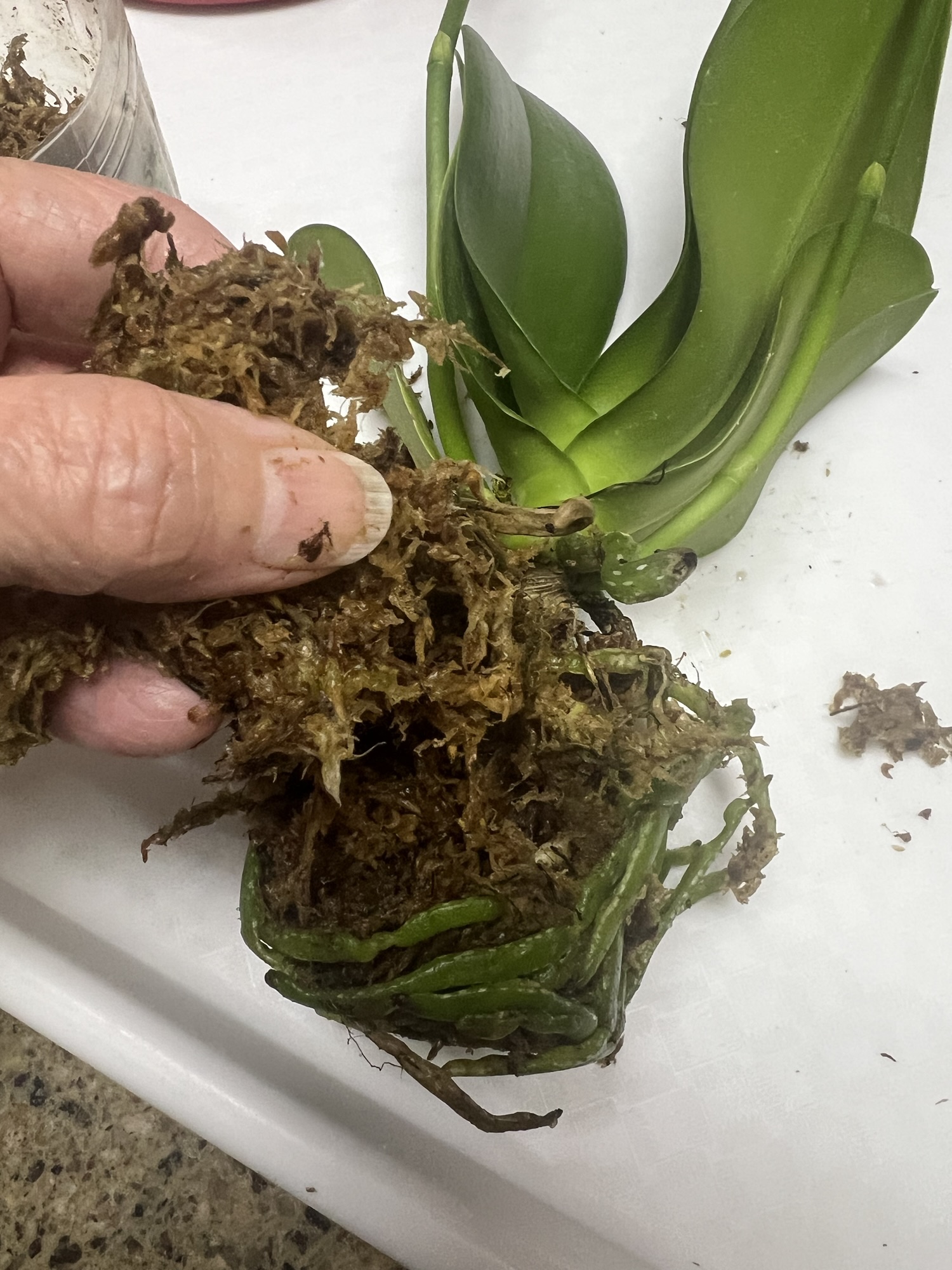 Since I know this orchid will be moved to water culture, it is important to remove all organic matter. Media that remains on the roots will decompose and cause water to become murky, so this cleaning step is important.